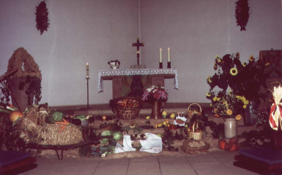 Kirche festlich aus. Zum Erntedankgottesdienst zieht die Brauchtumsgruppe dann in der heimischen Tracht in die Kirche ein und trägt dabei das Brot - eines unserer wichtigsten und elementarsten Grundnahrungsmittel - zum Altar. |