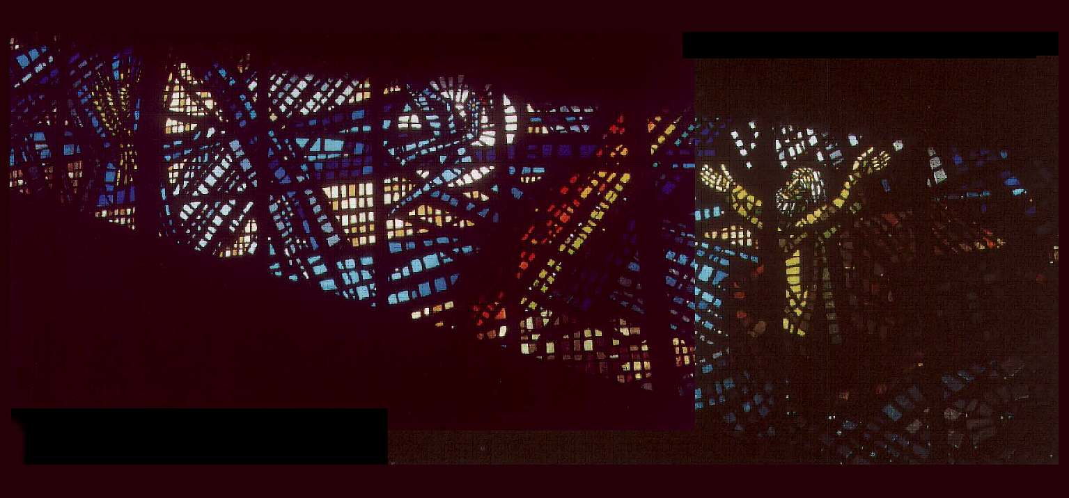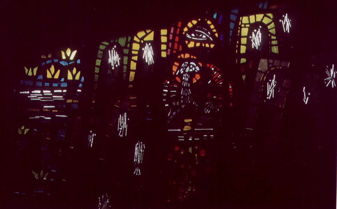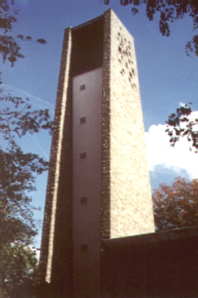 alten Wehrturm entstanden ist. Die Einweihung der neuen Kirche fand am Sonntag, den 28. Oktober 1962 statt. Der Gottesdienst wurde damals von dem Nordnassauer Propst K. Herbert gefeiert, die Festpredigt hielt Kirchenpräsident Martin Niemöller. Die Kirche, die nach einem Entwurf des Marburger Architekten B. Himmelmann errichtet wurde, hat einen quadratischen Grundriß mit einer Seitenlänge von 20 Metern, wobei die liturgische Ausrichtung in der Diagonalen liegt. Das bedeutet, daß der Altarraum mit Kanzel und Taufstein in einem der Winkel des Grundrisses angeordnet ist. Der Grundgedanke der Kirche - die Gemeinschaft der Heiligen - ist in den beiden großen Fenstern des aus Höhr-Grenzhausen stammenden Glasmalers und Bildhauers Eugen Keller abgebildet. Die Fenster sind seitlich des Altares angeordnet, laufen auf diesen hin spitz zu und verstärken so die Konzentration auf den Altarraum. |