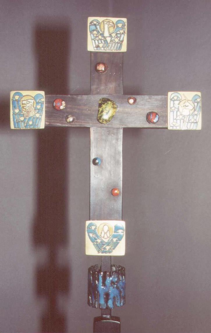 glauben, Vergebung und Erlösung finden. An den vier Ecken des Kreuzes finden sich die Symbole der vier Evangelisten, die uns von Jesu Leben, seinem Leiden, Sterben und Auferstehen berichten. Der Adler steht hierbei für Johannes, der Löwe für Markus, der Stier für Lukas und der Engel für Matthäus. |