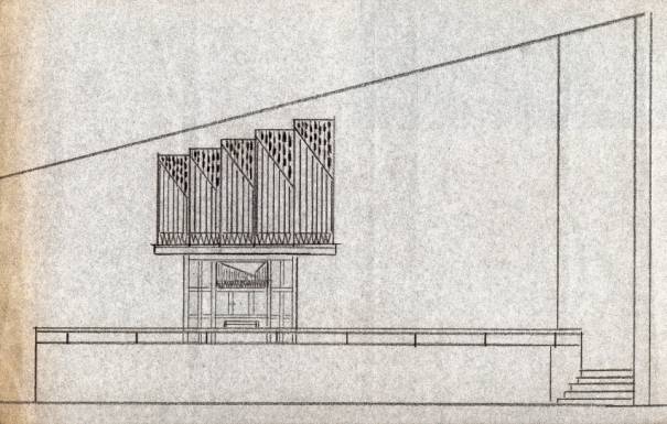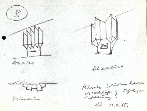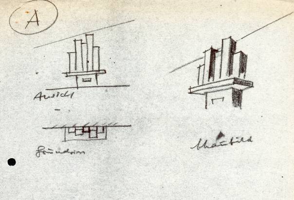 Abb. 5: Skizze von Architekt Himmelmann vom 10.04.1965, mit der er die nahezu abgeschlossene Diskussion neu entfachen wollte, weil der Entwurf Beckers mit einem eingezogenen Unterbau unter einer gewissen Stelzung leide. Himmelmann strebte eine Auflockerung der Formen an, in dem Entwurf Beckers bilde sich in der Anlage kein eigener Schwerpunkt. Becker hatte es in der bisherigen Diskussion übrigens strikt abgelehnt, eine Orgel mit einem Freipfeifenprospekt zu bauen, was Himmelmann am liebsten gewesen wäre. Himmelmann versucht mit dieser Skizze offensichtlich einen Kompromiss.