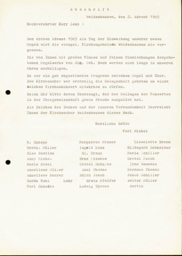 Zur Einweihung organisierte Pfr. Lenz am Abend des 28.11.1965 ein Orgelkonzert, das sein Bruder Christfried Lenz spielte. Zu Gehör kamen ausschließlich Orgelwerke von Johann Sebastian Bach: Präludium und Fuge in C-dur, Präludium und Fuge in A-dur, die Triosonate in Es-dur, insgesamt 10 Advents- und Weihnachtschoräle aus dem Orgelbüchlein sowie zum Ende Tokkata und Fuge dorisch (hier wird wohl d-moll gemeint sein). Der Kirchenchor sang unter der Leitung von Karl Michel insgesamt 7 Stücke. Immer wieder schön lesen sich die Gedanken der damaligen Akteure, so schreibet Christfried Lenz seinem Bruder am 06.12.1965: Was das Honorar betrifft, so habe ich folgendes gedacht: es soll 100 DM betragen, aber da mir bei einer solchen Summe für eine 1-stündige Leistung doch noch ein wenig schwindelig wird, sollst Du sie auf Eure diesjährige Sammlung Brot für die Welt schlagen und mir bitte die Quittung übersenden. Dazu kam es nicht, Pfr. Lenz bestand darauf, die 100 DM seinem Bruder auszuzahlen.