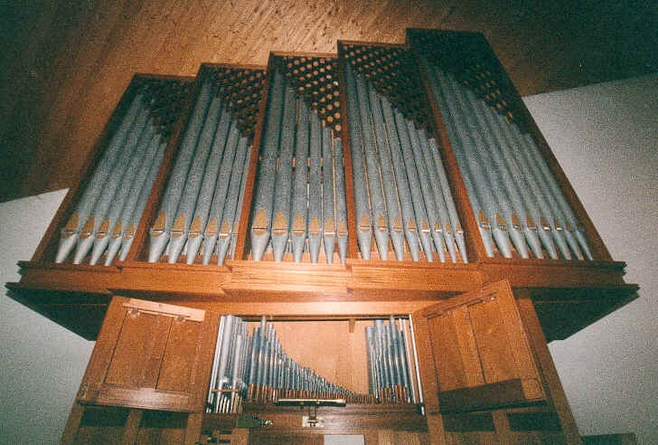 Im unteren Teil, direkt über dem Spieltisch befinden sich (in der Brust der Orgel) die Pfeifen des sogenannten Brustwerks. In die beiden Türen sind bewegliche Füllungen eingearbeitet, durch deren Verstellung man die Klangabstrahlung und Lautstärke beeinflusst werden kann. Darüber sieht man fünf Pfeifenfelder, wovon die drei linken dem "Hauptwerk" (in ihm stehen die wichtigsten und größten Pfeifen der Orgel) und die zwei rechten dem Pedalwerk zugeordnet sind. |